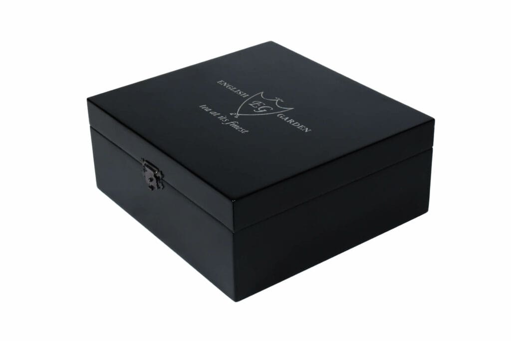 Black piano gloss hotel room tea box
